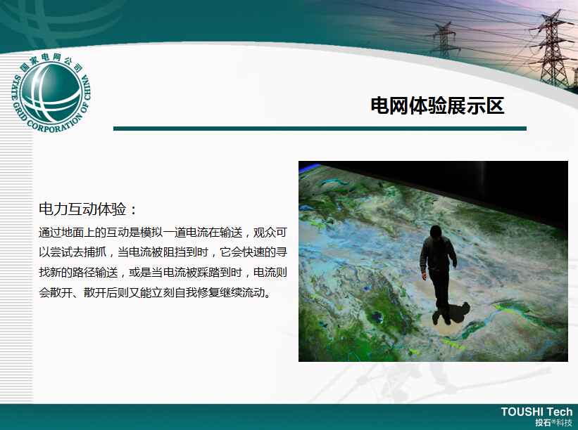 利用投石智能系統(tǒng)三維投影沙盤、全息屏幕、藝術(shù)模型等大量新穎的演示手段,展現(xiàn)了全球能源互聯(lián)網(wǎng)、特高壓規(guī)劃、清潔能源的分布與接入、電動汽車等國家電網(wǎng)的最新理念與重點(diǎn)項目,深度展示了智能電網(wǎng)的特征和內(nèi)涵。