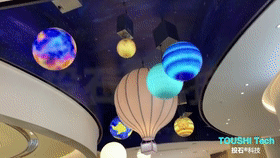 公共空間的頂部有8個(gè)星球,通過投石智能系統(tǒng)自主研發(fā)的控制芯片和定制的升降結(jié)構(gòu),把宇宙中各大行星隨機(jī)地在公共空間中上下自動(dòng)漂浮。而由于8個(gè)星球的直徑尺寸和重量的差異,本項(xiàng)目中需要定制不同功率的電機(jī)和結(jié)構(gòu),經(jīng)過大量的前期長(zhǎng)久性時(shí)間測(cè)試和現(xiàn)場(chǎng)調(diào)試,投石智能系統(tǒng)完美地實(shí)現(xiàn)了設(shè)計(jì)需求。