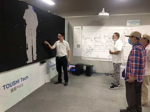 投石智能系統(tǒng)孫峰峰總經(jīng)理向來訪嘉賓介紹了公司新科技展品并一一展示效果。同時也表示這些互動裝置都廣泛適用在各個商場,美陳、展覽展示、兒童科技館等等。是商業(yè)體與消費者的粘合劑。