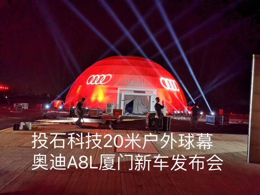 展示在車身的側(cè)面,營造出透視效果,以圓點的形式提示當前車身位置所具有的技術(shù)亮點,點擊圓點可查看科技點的詳細介紹。 5.奧迪A8L上市發(fā)布會360度沉浸式球幕大型戶外裝置