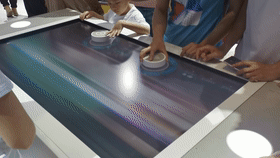 產(chǎn)品信息順著粒子瀑布水緩緩而下,流體流向體驗者面前的桌子,體驗者只需要輕輕動動手指就可以獲取媒體圖文信息。此互動支持多種素材表現(xiàn)形式定制:圖文,視頻,動畫展示等。 2.Audi Sport嘉年華浙賽運動型車賽道體驗項目