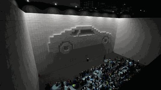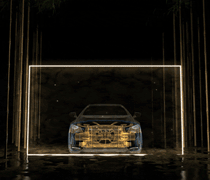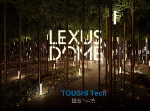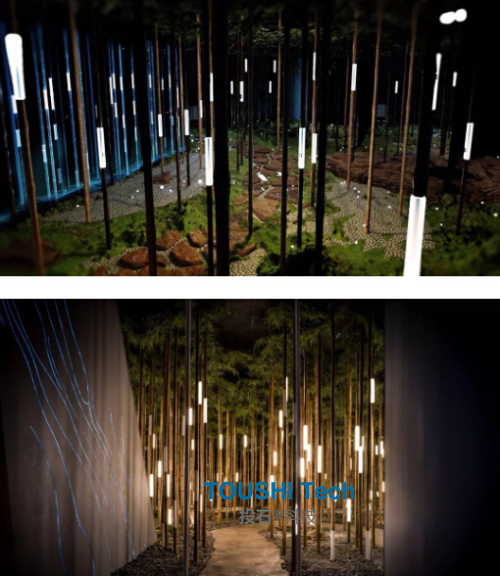 整體活動設(shè)計的概念是“冒險”,活動現(xiàn)場分為3個互動場景。 互動場景一:竹林LED燈光裝置。進入森林,所以竹林是入口和冒險的開始,一個現(xiàn)代的燈光裝置,突然在一個巨大的LED屏幕上繼續(xù),并在鏡子中無限反射。竹林中的燈光元素將會對進入的人們的存在和移動做出反應,用新技術(shù)的語言與他們進行對話。 互動場景二:“瀑布”裝置。一套特殊的水滴系統(tǒng)與特殊的照明同步,產(chǎn)生了水滴掛在空氣中或向上運動的幻覺。 互動場景三:互動墻面裝置。在墻面的淺浮雕上的投影,其輪廓精確匹配新車的外形尺寸:特別設(shè)計的墻面上的幾何形狀的淺浮雕,其靈感來源于流暢的流水,用于投影映射讓視頻看起來更加的立體生動。 5.賽車互動裝置