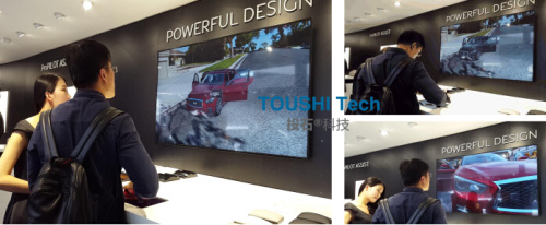 機(jī)械臂和透明屏幕的結(jié)合,還結(jié)合了AR的互動(dòng)。 Jeep展臺(tái)互動(dòng)(大屏搖一搖賽車互動(dòng))