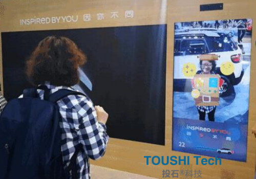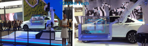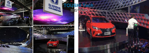 二是放大鏡互動(dòng),通過放大鏡可以觀看屏幕中的視頻,如果沒有通過放大鏡看顯示屏,是一塊干凈的白色。 長安展臺(tái)互動(dòng)(跳舞汽車)