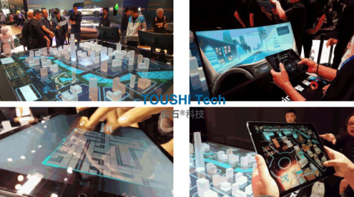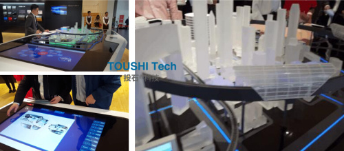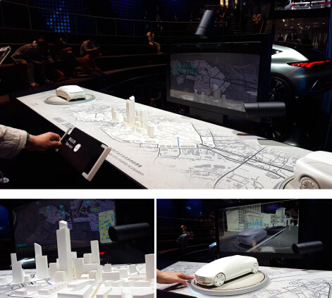 互動(dòng)沙盤裝有多個(gè)攝像頭,將沙盤拍出了真實(shí)生活中的角度,結(jié)合AR的動(dòng)畫內(nèi)容。 英菲尼迪展臺(tái)互動(dòng)(芯片感應(yīng)+實(shí)時(shí)三維演示系統(tǒng)+觸摸屏)