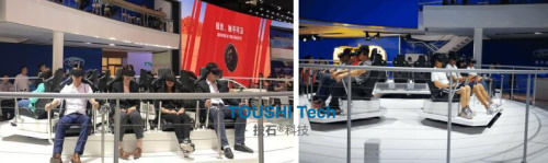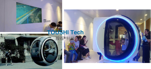 未來概念車體驗(yàn)艙,通過投影,模擬真實(shí)駕駛視覺。車內(nèi)還有塊屏幕,播放一些電視節(jié)目。讓人感覺置身于未來世界之中,成功吸引了經(jīng)過紅旗展臺(tái)的觀眾。 福特展臺(tái)互動(dòng)(VR動(dòng)感平臺(tái))