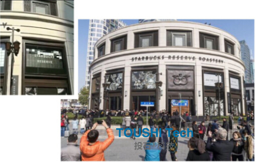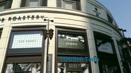 三角屏相比翻頁屏來說,顯得更為靜態(tài)。它鮮明的色彩感,無聲無息地點綴著建筑空間色調(diào)。 星巴克墻體翻頁屏裝置