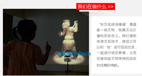 穿越時(shí)空的鼓瑟吹簫。東漢擊鼓說唱陶俑,“漢代第一俑”國家一級(jí)文物神采飛揚(yáng),靈動(dòng)古今!用體感交互技術(shù)將憨態(tài)可掬,生動(dòng)傳神的文物再現(xiàn),建立觀眾與文物的互動(dòng)。既尊重文物原型,又符合動(dòng)畫規(guī)律。讓觀眾在交流中體會(huì)樂俑的神韻。