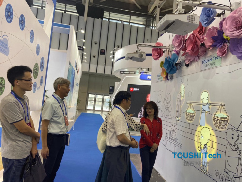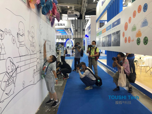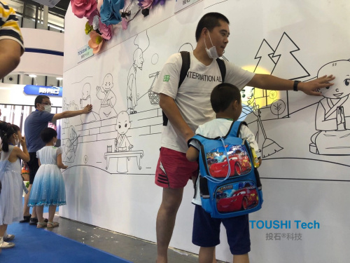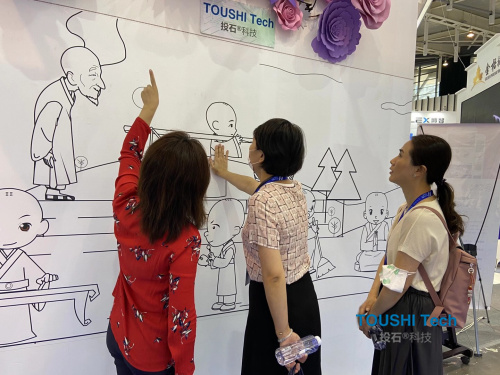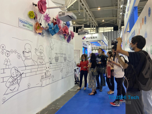 在為期4天的展會(huì)中,共有1000多家企業(yè)踴躍參展參會(huì),展覽總面積達(dá)8萬平方米。各家企業(yè)展出的黑科技裝置琳瑯滿目,都讓來到現(xiàn)場(chǎng)的觀眾大飽眼福。投石智能系統(tǒng)的機(jī)械動(dòng)態(tài)感應(yīng)花墻和小和尚觸摸布互動(dòng)投影墻兩款裝置深受現(xiàn)場(chǎng)觀眾的喜歡,他們帶著孩子在現(xiàn)場(chǎng)打卡互動(dòng)體驗(yàn)小和尚觸摸布互動(dòng)裝置,觸摸小和尚發(fā)出的動(dòng)畫效果形象生動(dòng),栩栩如生,玩的不亦樂乎。