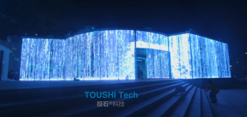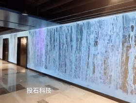 投石智能系統(tǒng)在一面長13.6米,高2.4米的墻面上,利用墻面投影技術(shù)在室內(nèi)體現(xiàn)水的特質(zhì)。水流從墻面頂部快速流下,會泛起白色的水花,同時還伴有瀑布浪花水流花濺射的音效。