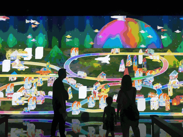 現(xiàn)場(chǎng)有彩色蠟筆和需要填色的各種房子、汽車(chē)、飛機(jī)的形狀,每個(gè)人根據(jù)自己的喜好填好顏色后,在3D掃描儀上一掃,你創(chuàng)作的房子、汽車(chē)和飛機(jī)就變成立體的出現(xiàn)在巨大的熒幕上,高架路上汽車(chē)會(huì)開(kāi)上開(kāi)下,拿手去碰一碰它會(huì)跳躍著和你打招呼,這個(gè)城市隨著越來(lái)越多人的創(chuàng)作變得越來(lái)越繁忙。 投石智能系統(tǒng)基于城市建設(shè)的游戲角度,重點(diǎn)讓小朋友動(dòng)手去參與,開(kāi)發(fā)孩子的想象力,創(chuàng)造力,讓小朋友在玩樂(lè)中學(xué)習(xí)到新的知識(shí)。