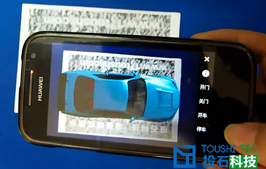 體驗(yàn)者拿起手機(jī)識(shí)別現(xiàn)場(chǎng)靜態(tài)圖案,手機(jī)里三維汽車會(huì)疊加顯示到現(xiàn)場(chǎng)場(chǎng)景內(nèi)。