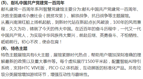 通過“體驗(yàn)教學(xué)中心”的建設(shè),將虛擬現(xiàn)實(shí)、虛擬仿真等技術(shù)引入黨建理論課實(shí)踐教學(xué)中,交互式、全景式、沉浸式教學(xué)環(huán)境讓紅色教育直觀化、生動(dòng)化、更深刻、更震撼,讓學(xué)習(xí)者更專注、更高效,體驗(yàn)者可以漫步在虛擬的空間體驗(yàn)獻(xiàn)禮建黨100周年系列、黨史系列、新中國(guó)史系列、社會(huì)主義發(fā)展史(思政)系列、新時(shí)代思想等系列、特色主題系列這六大系列39個(gè)館,最小的館2000平米,最大的館10000平米,包括智慧黨建管理平臺(tái),8大全景版紅色革命基地紀(jì)念館,讓體驗(yàn)者置身歷史長(zhǎng)河,在身臨其境中錘煉黨性,同時(shí)通過虛擬現(xiàn)實(shí)技術(shù),把黨建內(nèi)容植入構(gòu)建的虛擬展廳中,讓體驗(yàn)者漫步在虛擬的展廳,通過觀看圖片、視頻、AI語音講解、智能答題等方式在虛擬的時(shí)空學(xué)習(xí),節(jié)省傳統(tǒng)教育場(chǎng)地成本、宣講人員成本、教育模式單一等問題。