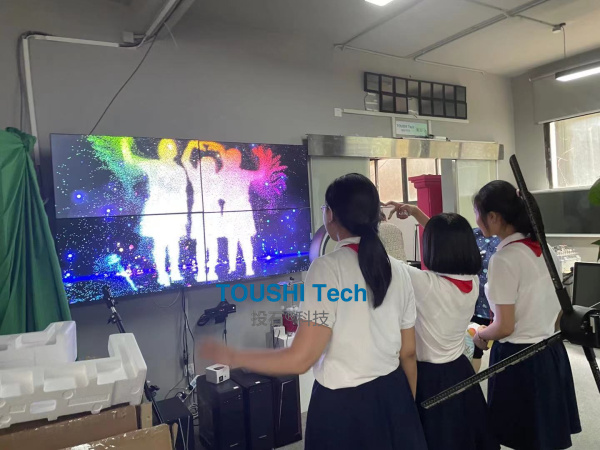一個(gè)個(gè)與科技有關(guān)的互動小游戲,讓每一個(gè)學(xué)生都忘記了時(shí)間。每次小小操作體驗(yàn)互動的成功,都使孩子們眼睛發(fā)亮,引起歡呼。在此次參觀體驗(yàn)過程中,投石智能系統(tǒng)新媒體藝術(shù)展廳互動設(shè)備令師生們都大開眼界,興奮之情溢于言表。