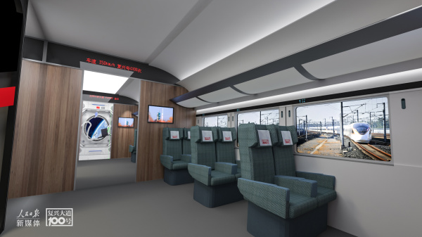 隨著一聲鳴笛,一輛飛速奔馳的復興號從軌道上奔馳而出。繞著飛馳到熒幕的中間位置,最后駛出了熒幕 影片結束。