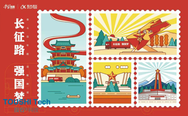 明信片設(shè)計(jì)底圖為正紅色,圍繞井岡山,寶塔山,烈士陵園,六盤山四副圖為形象代表,主題為:長征路,強(qiáng)國夢(mèng)。