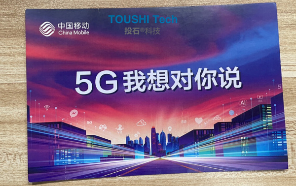 明信片封面圍繞5G我想對(duì)你說為主題,底圖為繁華的城市被WiFi、5G、AI等等延伸開。