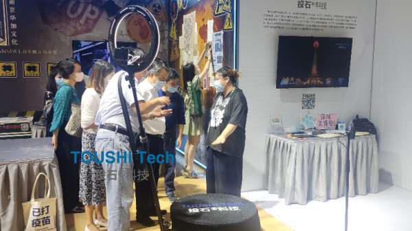 展會(huì)現(xiàn)場(chǎng)體驗(yàn)圖: 展會(huì)現(xiàn)場(chǎng),投石智能系統(tǒng)現(xiàn)場(chǎng)展示的“人像復(fù)刻機(jī)”、360度旋轉(zhuǎn)拍照裝置完美融合了“文化+科技”的創(chuàng)新元素,展現(xiàn)AR增強(qiáng)現(xiàn)實(shí)、4K高清技術(shù)等現(xiàn)代科技的運(yùn)用。“數(shù)字南京”趣味多多,帶來(lái)許多富有體驗(yàn)性、互動(dòng)性的產(chǎn)品,投石智能系統(tǒng)跑出文化產(chǎn)業(yè)“加速度”。