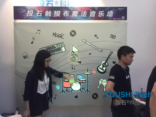 地面互動(dòng)游戲,當(dāng)游客步入投影在地面上的水池動(dòng)畫畫面時(shí),魚兒像受了驚嚇,紛紛游開,當(dāng)游客一離開,魚兒又會(huì)正常游動(dòng),一切都如同身臨其境,從而營造一個(gè)美麗虛幻的魔幻空間,將不可能變?yōu)榭赡?,將游客帶入一種虛實(shí)融合、亦真亦幻的奇妙世界。投石地面互動(dòng)投影系統(tǒng)自帶近40多款互動(dòng)游戲,極大地滿足了市場上常見的互動(dòng)游戲需求。 3.音樂墻