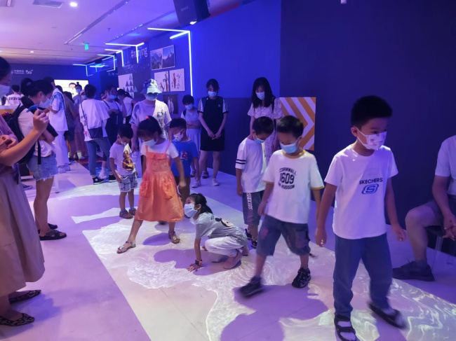 展會現(xiàn)場圖:大朋友小朋友體驗投石3D海浪地面互動裝置