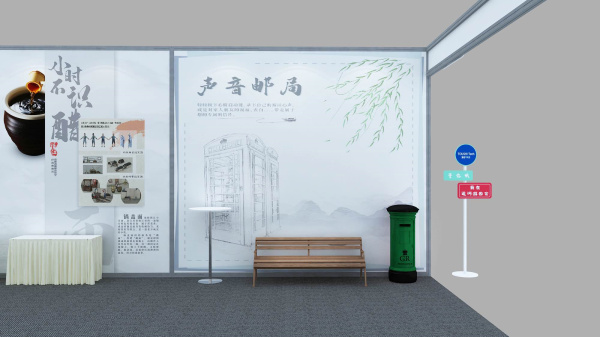 投石聲音郵局是以聲音采集及轉(zhuǎn)換技術(shù)為主的聲音展示設(shè)備,通過(guò)采集用戶聲音在進(jìn)行軟件處理轉(zhuǎn)換變成聲紋和二維碼印在明信片上,用戶體驗(yàn)時(shí)點(diǎn)擊屏幕上開(kāi)始標(biāo)志,說(shuō)出想要錄入的語(yǔ)句,機(jī)器通過(guò)聲音采集播放軟件采集,記錄用戶聲音,用戶確認(rèn)語(yǔ)句說(shuō)完,點(diǎn)擊完成,頁(yè)面出現(xiàn)試聽(tīng),刪除,保存三個(gè)標(biāo)志,用戶可自行選擇,用戶確認(rèn)聲音無(wú)誤并保存后,二維碼自動(dòng)生成程序?qū)⒂脩舻穆曇艮D(zhuǎn)化成二維碼和聲紋,生成有二維碼和聲紋的聲音明信片,通過(guò)掃描明信片上的二維碼即可聽(tīng)到語(yǔ)音錄入的。明信片也可以寄出,收件人收到明信片后,掃描明信片上二維碼即可聽(tīng)到用戶錄入的音頻。 圖:聲音郵局布展設(shè)計(jì)圖