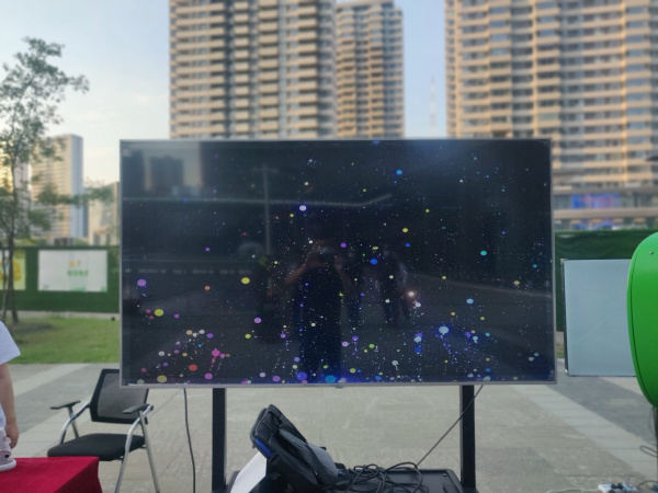 AR許愿樹(shù)主要由LED燈光塔、許愿樹(shù)軟件組成。用手機(jī)掃描它的燈柱,可以發(fā)現(xiàn)柱子的周圍飄浮著文字,就可以進(jìn)行手機(jī)AR許愿。該裝置支持多人互動(dòng),使用手機(jī)或者平板就可以操作自如。使用時(shí)首先根據(jù)提示,用手機(jī)掃描二維碼,就可以打開(kāi)許愿頁(yè)面;然后可以編輯祝福話語(yǔ),并選擇發(fā)送;最后就可以通過(guò)手機(jī)或平板觀看到許愿的效果。 體感粒子互動(dòng)屏
