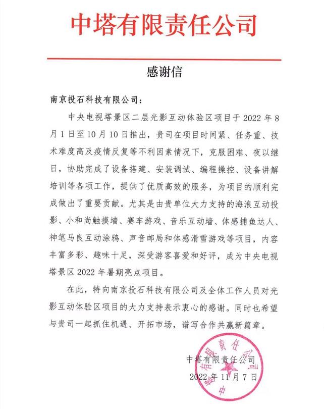 2022年11月7日,投石智能系統(tǒng)收到來自中塔有限責任公司感謝信。由中央廣播電視塔打造,投石智能系統(tǒng)聯(lián)合投資建設(shè)親子光影互動體驗館項目于2022年8月1日至10月10日推出。