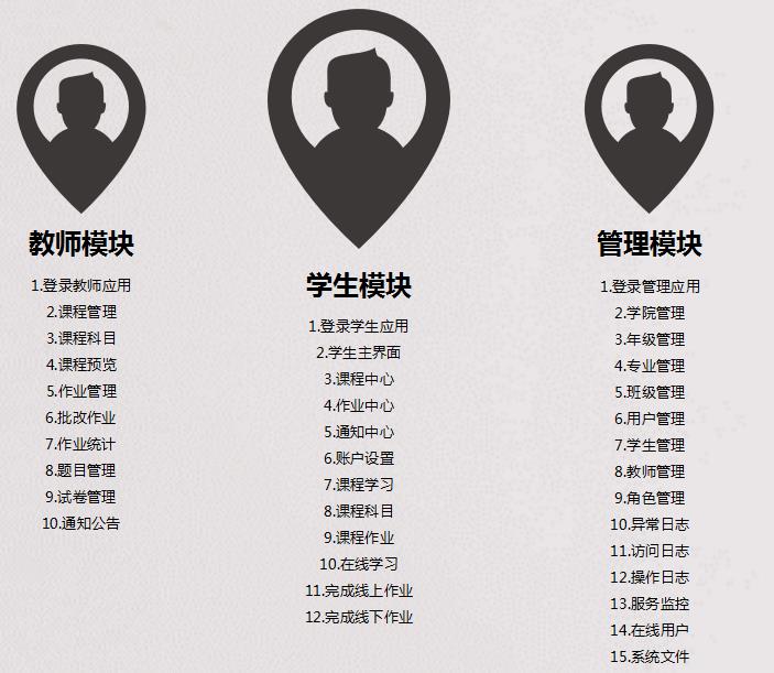 投石生涯教育平臺(tái)軟件包含三大模塊:學(xué)生模塊、教師模塊、管理模塊。其軟件模塊如圖所示: