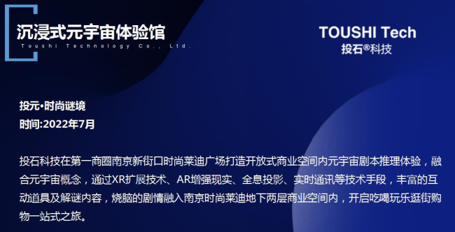 在2022年12月19日舉辦的“元宇宙產(chǎn)業(yè)創(chuàng)新研討會暨長三角元宇宙產(chǎn)業(yè)化應(yīng)用發(fā)展圓桌會”由江蘇省公共關(guān)系協(xié)會、江蘇省數(shù)字商務(wù)發(fā)展聯(lián)盟、創(chuàng)新江蘇論壇組委會、上海大學(xué)上海元宇宙研究中心支持,華潤置地南京片區(qū)公司承辦,邀請了投石智能系統(tǒng)、陜西文投、思德科技等企業(yè)參與研討。