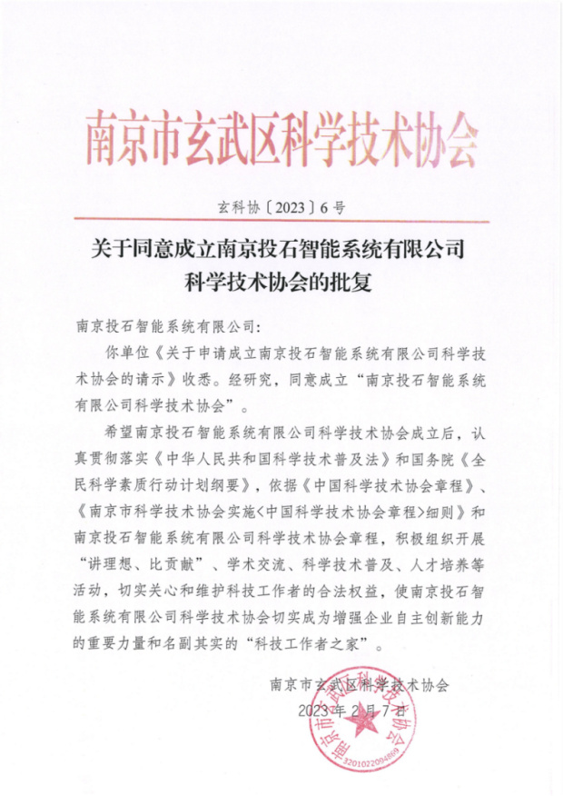 2023年2月,南京投石智能系統(tǒng)有限公司收到南京市玄武區(qū)科學技術(shù)協(xié)會發(fā)布〔2023〕6號文件《關(guān)于同意成立南京投石智能系統(tǒng)有限公司科學技術(shù)協(xié)會的批復》文件通知。同意成立“南京投石智能系統(tǒng)有限公司科學技術(shù)協(xié)會”。批復文件主要內(nèi)容如下: