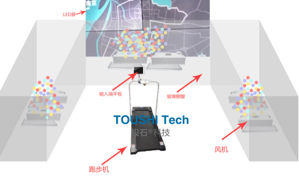 投石科技跑步機(jī)互動(dòng)裝置是建立一個(gè)數(shù)據(jù)平臺(tái),通過(guò)平板電腦簡(jiǎn)單操作可控制跑步機(jī)的速度,體驗(yàn)不同城市的跑步路線,在大屏上實(shí)時(shí)顯示跑者的速度和配速,同時(shí)根據(jù)跑者的運(yùn)動(dòng)數(shù)據(jù),系統(tǒng)分析出跑者跑完路線的所需時(shí)間。