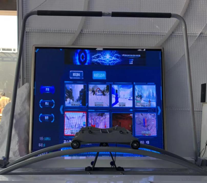 站上滑雪板,戴上VR眼鏡,左右搖擺身體,屏幕上的人物也隨之左右移動(dòng),沉浸式體驗(yàn)滑雪的樂(lè)趣。