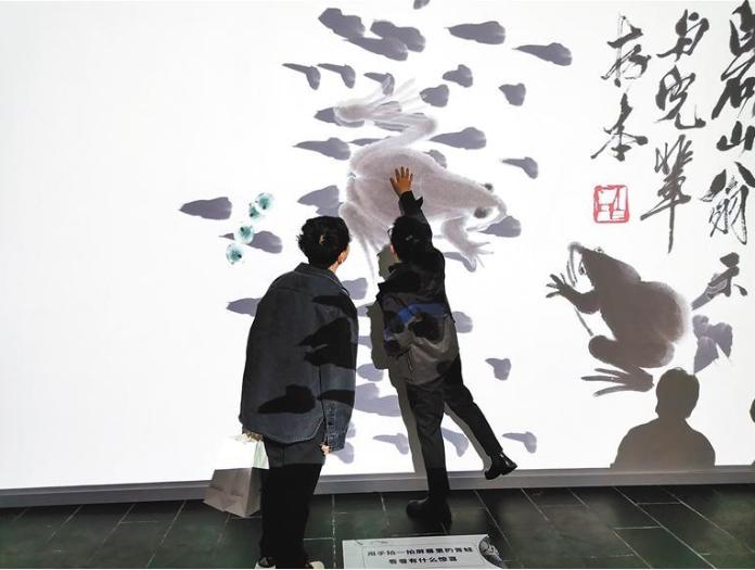 當(dāng)傳統(tǒng)水墨畫“潮”起來(lái),“動(dòng)”起來(lái):與人對(duì)話的鸚鵡,簇?fù)碇蝌絺兺嫠5那嗤?,從盤碟倉(cāng)皇“逃走”的蒼蠅……都讓人忍俊不禁,許多觀眾體驗(yàn)了一次又一次,在沉浸式的參觀互動(dòng)中,感受大師的風(fēng)采,感受中國(guó)水墨的別樣神韻。