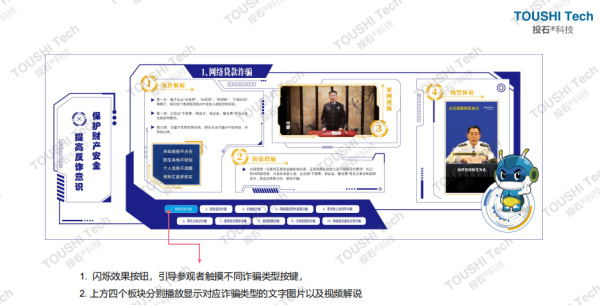 1.閃爍效果按鈕,引導(dǎo)參觀者觸摸不同詐騙類型按鍵