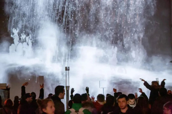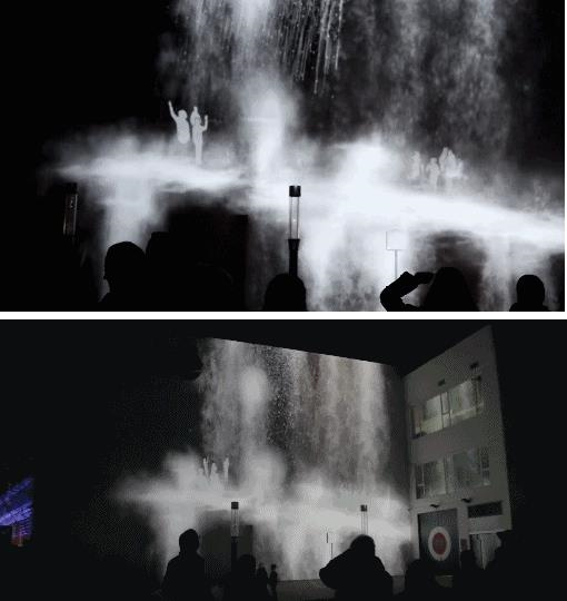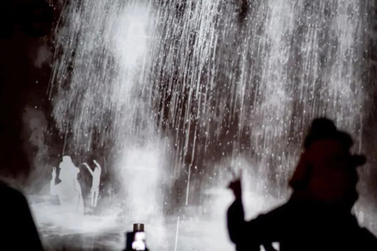 運(yùn)用水驅(qū)動元素形成自上而下的垂直瀑布,而觀看瀑布的人群被虛幻朦朧的投射在自然場景中。