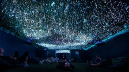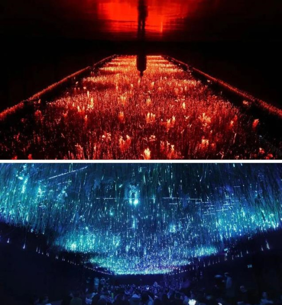 在空間中,使用定制激光投影儀,結(jié)合聲音系統(tǒng),形成夢幻唯美的波浪極光。沉浸在整個空間如置身星空夢境,又像是螢火漫天。