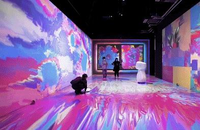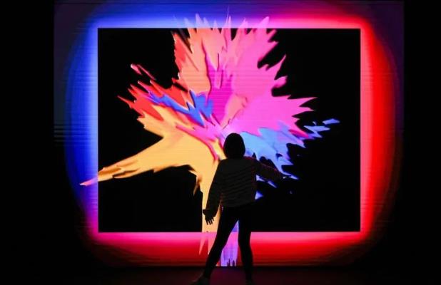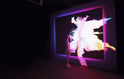 在沉浸式空間,參與者可與屏幕進(jìn)行畫面互動,揮動手臂,即將探索一場創(chuàng)造性的藝術(shù)之旅。