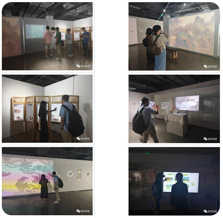 下面是投石智能“AI與中國古典藝術(shù)的氣韻再生”展覽作品:《指尖靈犀》、《羽跡回歸》、《氣韻再生》、《笑傲江湖》、《審美書頁》、《丹青墨語》、《茶韻悠然》和《青韻繪世》等互動體驗精彩瞬間圖集,你可以遠觀作品中的山水畫,也可以近距離接觸互動裝置,與劇情互動,參與其中。 圖:參觀者在工作人員引導下體驗新技術(shù)的獨特魅力