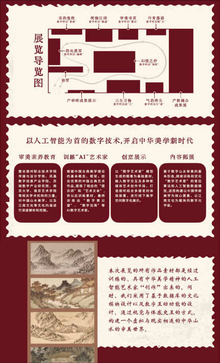 本次展覽是滁州職業(yè)技術(shù)學(xué)院和南京投石智能系統(tǒng)有限公司等聯(lián)合開展的AI與中國古典藝術(shù)氣韻再生展暨產(chǎn)教融合成果展,是校企產(chǎn)學(xué)研合作、產(chǎn)教融合的典范成果展,充分體現(xiàn)了技術(shù)與藝術(shù)、科技與文化融合的新趨勢。