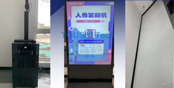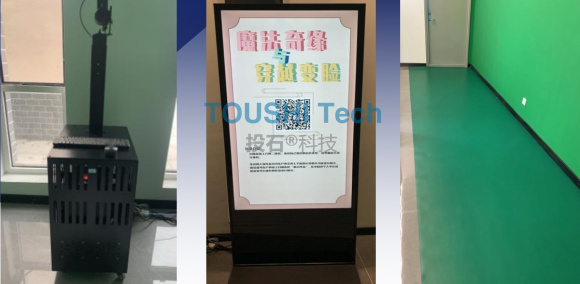 室內(nèi)游客中心為拍照互動區(qū)域。分為白幕拍攝“人像復(fù)刻機”區(qū)域和綠幕拍攝區(qū)域。其中綠幕拍攝為“穿越變臉”和“魔法奇緣”兩個游戲。游客通過掃描屏幕上方的二維碼付費開啟游戲。最終可在室外大屏上選擇展示作品展示拍攝的視頻或者圖片。