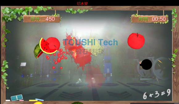 切水果:進入游戲根據(jù)游戲智能引導(dǎo),玩家左右上下移動,揮動雙手去切掉落的水果。