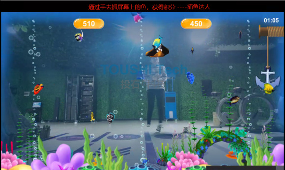 進入游戲界面,體驗者使用肢體動作和手勢,如舉手、跳躍、奔跑等簡單姿勢直接對屏幕內(nèi)容凌空操控,實現(xiàn)新的人機交互體驗。您可以和自己的小伙伴一起PK誰捕的魚更多,一起體驗切水果,也可以自己一個人體驗酷跑吃金幣的快樂。