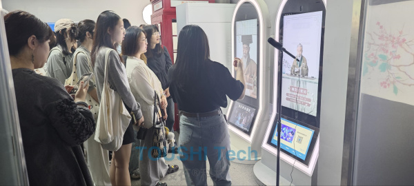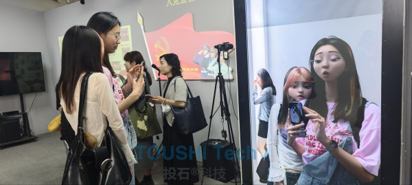 在展廳內(nèi),投石科技工作人員熱情接待了來訪的師生,并逐一介紹了展廳內(nèi)的機械磁力屏、人像復(fù)刻機、漫畫變臉、氣韻再生AI繪畫等各類互動裝置。這些裝置不僅融合了現(xiàn)代科技與藝術(shù)設(shè)計的精髓,更體現(xiàn)了投石科技在新媒體藝術(shù)領(lǐng)域的創(chuàng)新實力。師生們紛紛駐足觀看,認(rèn)真學(xué)習(xí)并親身體驗了這些互動產(chǎn)品,尤其是和南京大學(xué)、南京信息職業(yè)技術(shù)學(xué)院等高校的合作的"AI與中國古典藝術(shù)的氣韻再生"系列裝置,AIGC拍照機、氣韻再生AI繪畫大模型等人工智能產(chǎn)品,感受到了科技與藝術(shù)相結(jié)合的獨特魅力。
