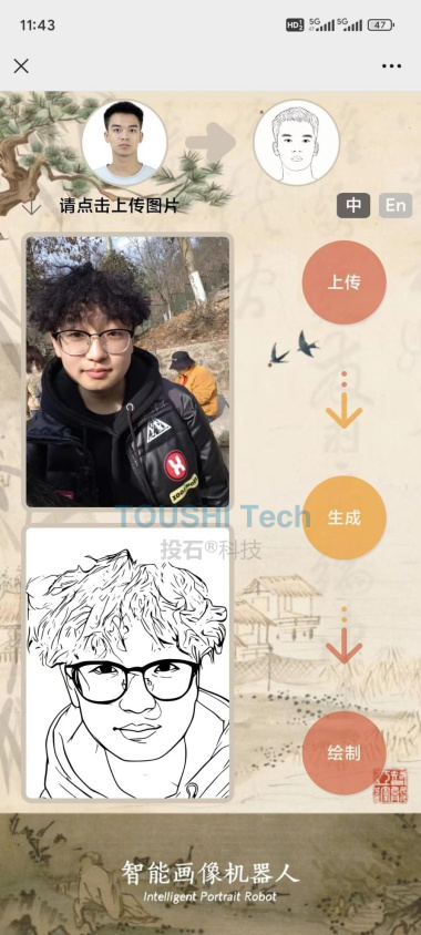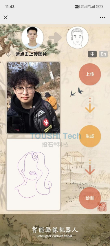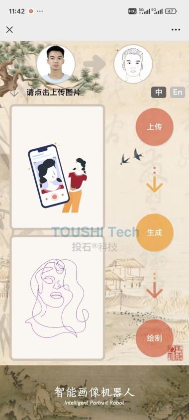 1.用戶掃描二維碼進入小程序 2.點擊上傳按鈕拍攝或者選擇一張照片 3.點擊生成按鈕生成線條肖像畫 4.最后點擊繪制按鈕機器人開始繪畫 5.最終效果