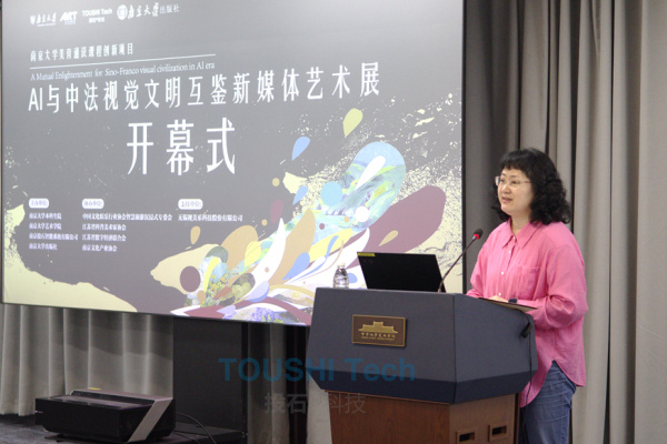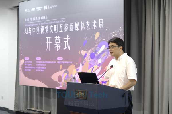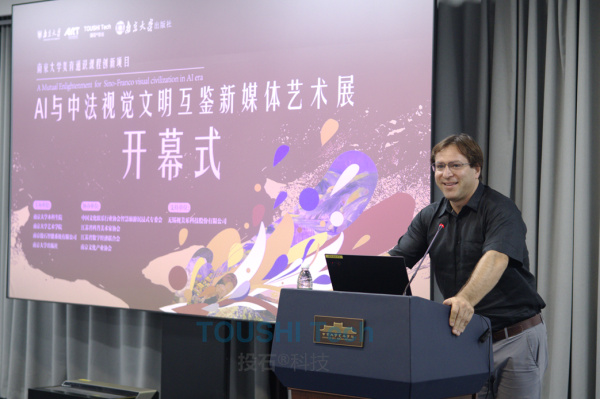 南京法語聯(lián)盟主任David Couvidat發(fā)表了熱情洋溢的致辭,他稱贊此次展覽是促進(jìn)中法友誼的一份珍貴的禮物。南京大學(xué)的師生的創(chuàng)作力、科研能力以及與企業(yè)合作對AI技術(shù)的創(chuàng)新使用能力對促進(jìn)中法交流必將發(fā)揮更加重要的作用。