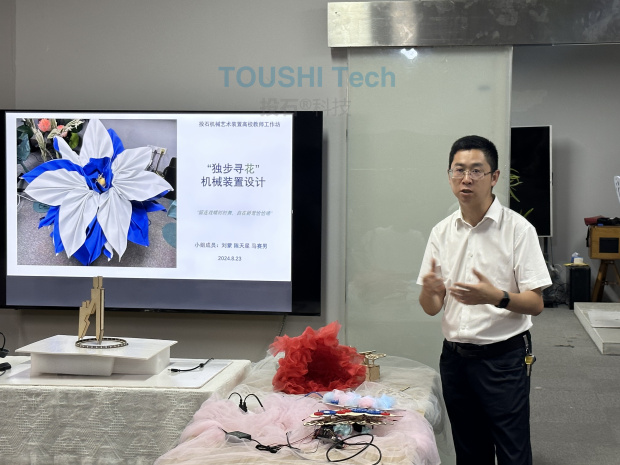 8月23日,訓(xùn)練營(yíng)迎來了最為激動(dòng)人心的時(shí)刻——原型制作與展示。在老師們的指導(dǎo)下,學(xué)員們將創(chuàng)意轉(zhuǎn)化為實(shí)物,一件件充滿創(chuàng)意與科技感的機(jī)械藝術(shù)裝置作品應(yīng)運(yùn)而生。 在下午的結(jié)業(yè)儀式上,學(xué)員們分組展示了自己的作品,每一件裝置都充滿了創(chuàng)意與巧思,將機(jī)械的力量與藝術(shù)的美感產(chǎn)生融合,展現(xiàn)出了強(qiáng)烈的視覺沖擊力和獨(dú)特的藝術(shù)魅力。學(xué)員們通過分享創(chuàng)作過程中的心得與體會(huì),加深了對(duì)投石智能提出的“藝術(shù)與科技方法論”的理解,也激發(fā)了更多關(guān)于機(jī)械藝術(shù)裝置創(chuàng)作的靈感與思考。 南師大中北學(xué)院美術(shù)與設(shè)計(jì)學(xué)院環(huán)境設(shè)計(jì)專業(yè)副教授余然作為學(xué)員代表表示:參與投石智能組織的機(jī)械藝術(shù)裝置訓(xùn)練營(yíng)讓我深刻體會(huì)到跨學(xué)科融合對(duì)學(xué)生創(chuàng)意思維發(fā)展的重要性。在訓(xùn)練營(yíng)中,我們通過機(jī)械原理與藝術(shù)表達(dá)的結(jié)合,打破了傳統(tǒng)設(shè)計(jì)思維的桎梏,賦予了設(shè)計(jì)作品更多的動(dòng)感與互動(dòng)性。這種實(shí)踐性極強(qiáng)的訓(xùn)練方式,激發(fā)了我對(duì)機(jī)械結(jié)構(gòu)與美學(xué)表現(xiàn)的興趣,還提升了動(dòng)手能力與團(tuán)隊(duì)協(xié)作意識(shí)。通過這次訓(xùn)練營(yíng),我更加認(rèn)識(shí)到將科技與藝術(shù)相結(jié)合的教學(xué)模式,將為未來環(huán)境設(shè)計(jì)領(lǐng)域培養(yǎng)出更具創(chuàng)新精神的設(shè)計(jì)人才奠定堅(jiān)實(shí)基礎(chǔ),也為未來與投石智能開展產(chǎn)教融合和微專業(yè)課程共同建設(shè)更有信心和奠定了成熟的技術(shù)路徑。 來自南京工程學(xué)院藝術(shù)與設(shè)計(jì)學(xué)院的教師許悅、許娟、閆勝昝等老師都表示感謝科普美協(xié)和投石智能搭建的高級(jí)機(jī)械藝術(shù)裝置工作坊平臺(tái),這次訓(xùn)練營(yíng)科技與藝術(shù)的深度融合激發(fā)了大家對(duì)機(jī)械藝術(shù)裝置創(chuàng)作的熱情,這種跨界融合的平臺(tái)將為教師們的創(chuàng)作帶來無限可能,都期待未來能有更多這樣的機(jī)會(huì),探索科技與藝術(shù)的無限可能。 來自南京審計(jì)大學(xué)金審學(xué)院藝術(shù)設(shè)計(jì)學(xué)院的教師劉蒙、陳天星等老師都表示這次訓(xùn)練營(yíng)讓大家深刻感受到了科技與藝術(shù)的完美結(jié)合,通過與來自不同領(lǐng)域的專家和同行交流,對(duì)未來課程教學(xué)和產(chǎn)教融合帶來了新的技術(shù)形式的嘗試。 江蘇省科普美術(shù)家協(xié)會(huì)副秘書長(zhǎng)周芳竹代表協(xié)會(huì)為成績(jī)合格的學(xué)員頒發(fā)了結(jié)業(yè)證書,投石智能董事長(zhǎng)孫峰峰對(duì)大家的作品給予了高度評(píng)價(jià),并做專業(yè)點(diǎn)評(píng)和建議。這些優(yōu)秀作品不僅體現(xiàn)了學(xué)員們?cè)谟?xùn)練營(yíng)期間的辛勤付出與不懈努力,也彰顯了科技與藝術(shù)融合的巨大潛力與廣闊前景。 總結(jié)與展望
