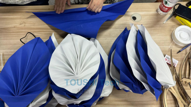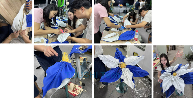 在制作花瓣時,需要用CNC加工出花瓣的結(jié)構(gòu)骨架,以作為花瓣進行后期開合的依托 用海綿紙代替染布效果,搭建原型外觀,約25cm花瓣,6組2層 團隊協(xié)同: