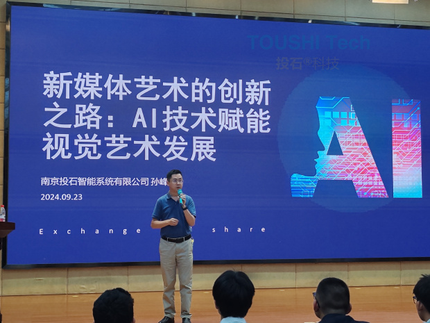 在隨后的講座中,孫峰峰先生特別強(qiáng)調(diào)了AI技術(shù)在數(shù)字內(nèi)容生產(chǎn)和應(yīng)用中的重要作用,結(jié)合投石科技新媒體藝術(shù)創(chuàng)作的案例,如數(shù)字人、AI音樂、AI美育等,進(jìn)行案例賞析和技術(shù)分析,探索藝術(shù)和科技的相互作用,理解二者之間的聯(lián)系,以及如何使用AI技術(shù)在數(shù)字媒體藝術(shù)專業(yè)領(lǐng)域中進(jìn)行創(chuàng)新性表達(dá)和數(shù)字內(nèi)容生產(chǎn)。