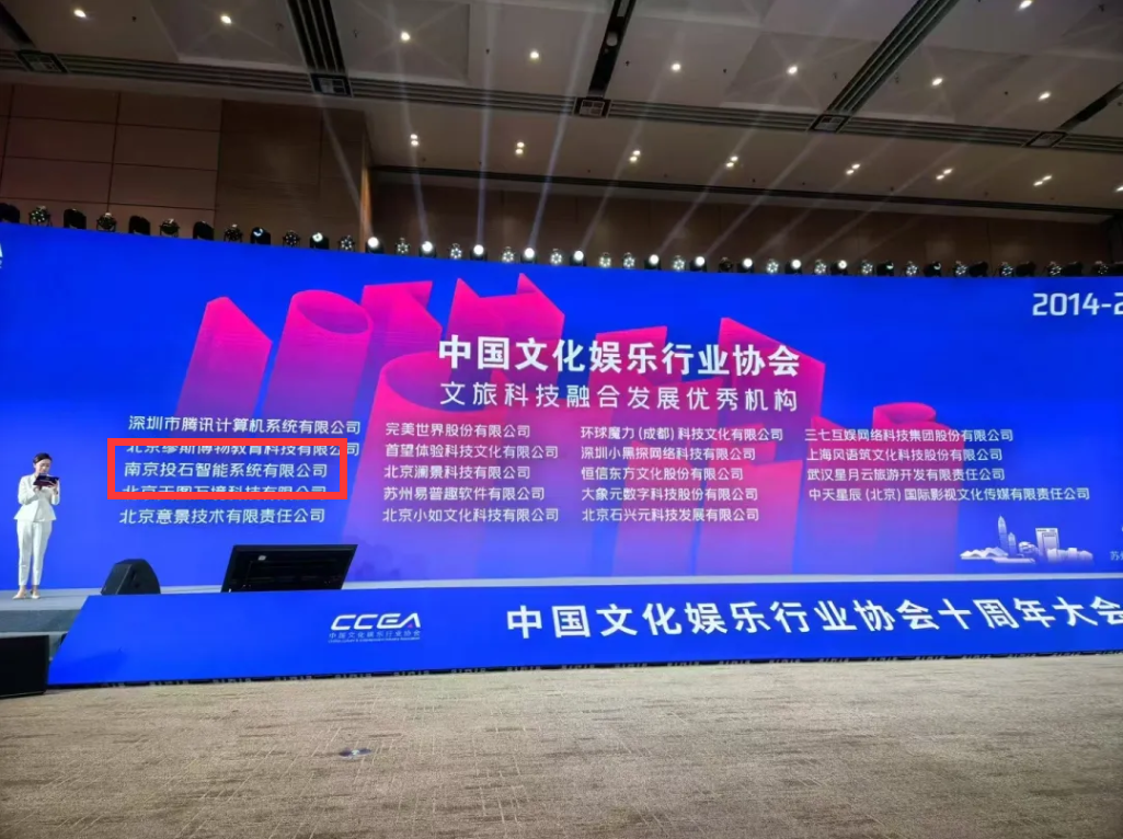 在眾多優(yōu)秀企業(yè)中,南京投石智能系統(tǒng)有限公司榮獲“文旅科技融合發(fā)展優(yōu)秀機構(gòu)”稱號。這一殊榮不僅是對投石文旅的高度認可,更是充分彰顯了中國文化娛樂行業(yè)協(xié)會的權(quán)威性。這一殊榮不僅是對投石文旅的高度認可,更是對其在科技與文化融合領(lǐng)域所取得成果的充分肯定。