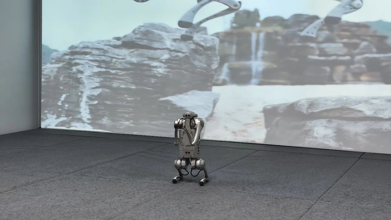 研討會在章劍華作詞、AI作曲演唱的《給Al一個擁抱》歌聲中拉開帷幕。南京中華職業(yè)技術(shù)學校師生帶來的“機器狗”表演,迅速點燃全場氣氛。